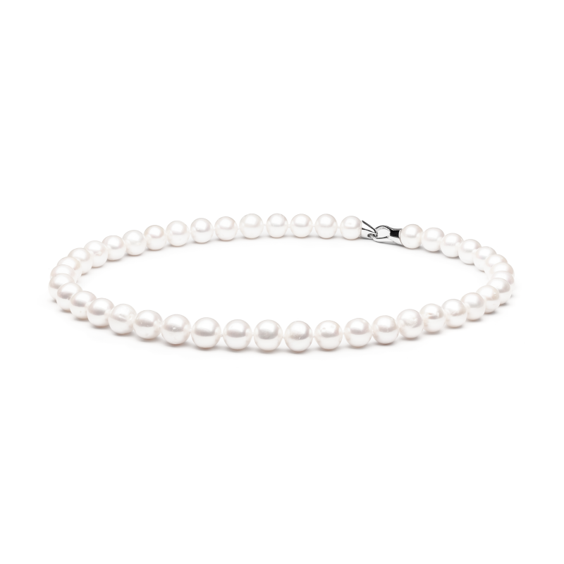 Balti kultūriniai perlai, 9,5-10,5 mm. Rodžiu dengto sidabro užsegimas. Praba 925.