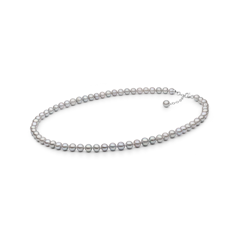 Pilki kultūriniai perlai, 8-9 mm. Rodžiu dengto sidabro užsegimas. Praba 925.