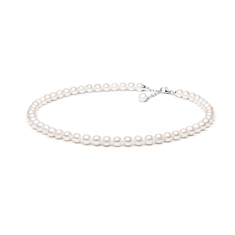 Balti kultūriniai perlai, 7,5-8 mm. Rodžiu dengto sidabro užsegimas su prailginimo grandinėle iki 48cm. Praba 925.