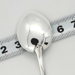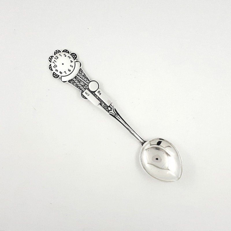 Oksiduoto sidabro šaukštelis. Numatyta vieta svorio, ūgio, datos ir laiko graviravimui. Praba 925.