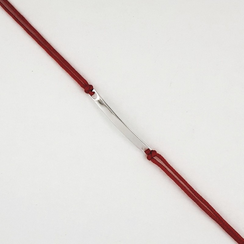 Rodžiuotas sidabras. Raudonas tekstilės siūlas su plokštele. Su ilgio reguliavimu. Praba 925.
