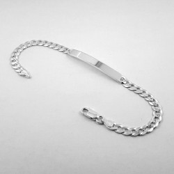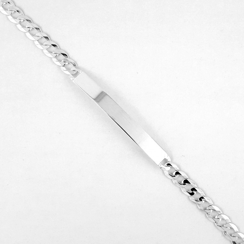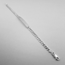 Balto sidabro vyriška apyrankė su plokštele. Praba 925. Klasikinio (Curb) pynimo iš 1.2 mm storio sidabrinės vielos grandinėlė, plokščiai šlifuota (Extraflat), poliruojama ir padengiama 999 prabos sidabru dėl didesnio atsparumo išorės poveikiui. Plokštelė 5x40 mm.