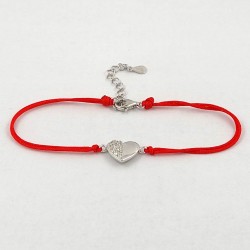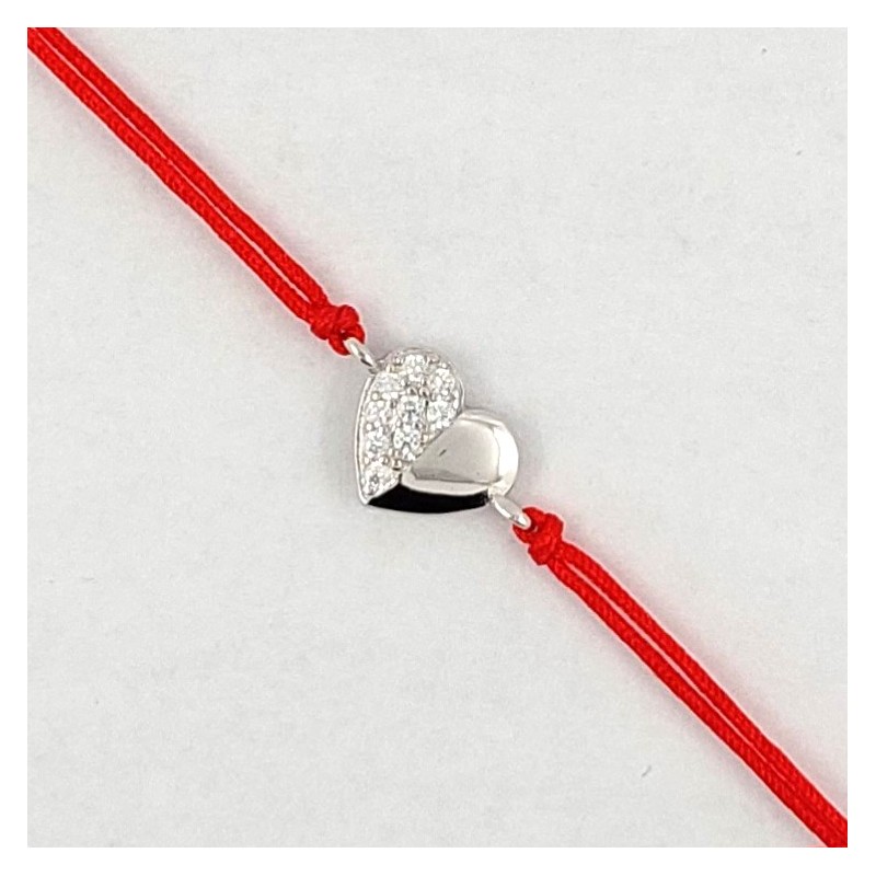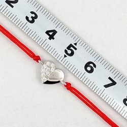 Dvigubas raudonas siūlas. Rodžiuoto sidabro elementas -širdelė, papuošta cirkonais. Prailginimo grandinėlė. Praba 925.