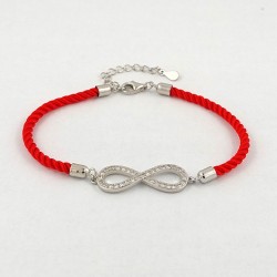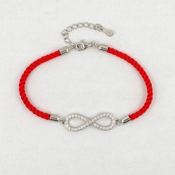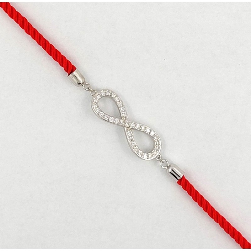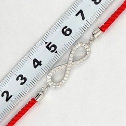 Raudona virvutė. Rodžiuoto sidabro elementas Begalybė, inkrustuotas cirkonais. Prailginimo grandinėlė. Praba 925.