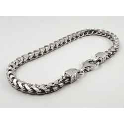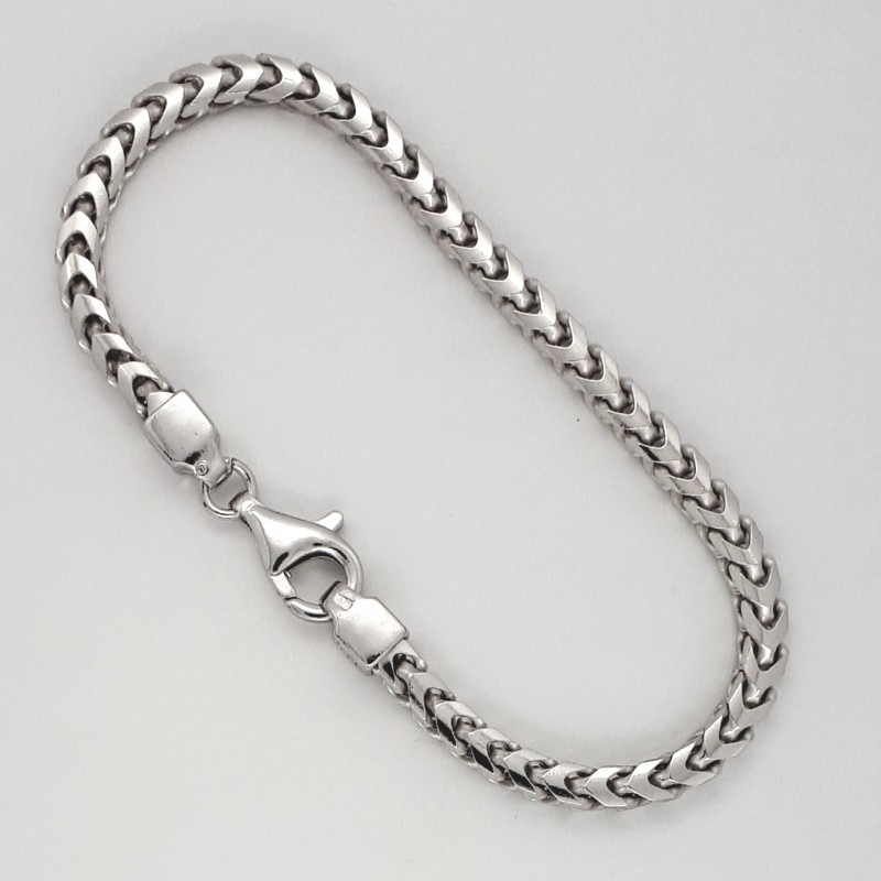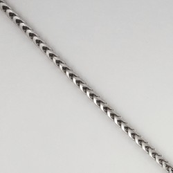 Erdvinė rodžiuoto sidabro apyrankė. Praba 925. Vyriška. Sudėtinga grandelių forma suteikia vienam grandinėlės šonui klasikinio pynimo Curb vaizdą, kitam šonui strėlinio pynimo pavidalą.