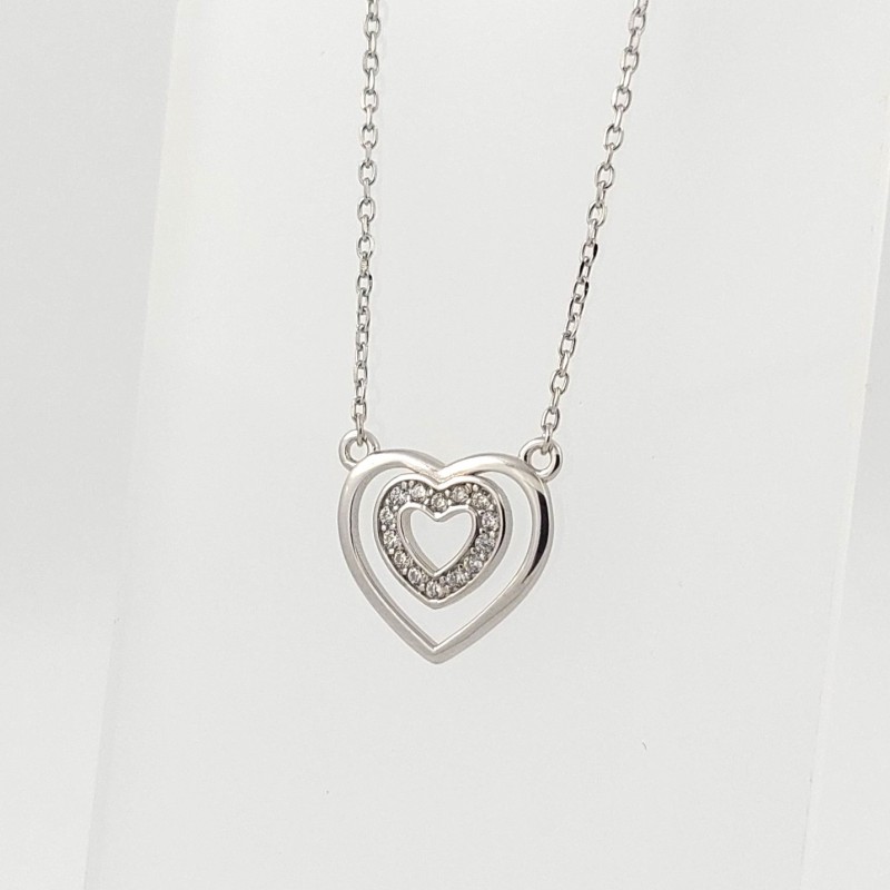 Rodžiuoto sidabro "inkarinio" pynimo grandinėlė. Nenuimamas pakabukas Širdelė papuoštas cirkonais. Prailginimo grandinėlė leidžia keisti ilgį nuo 42 iki 45 cm. Praba 925.