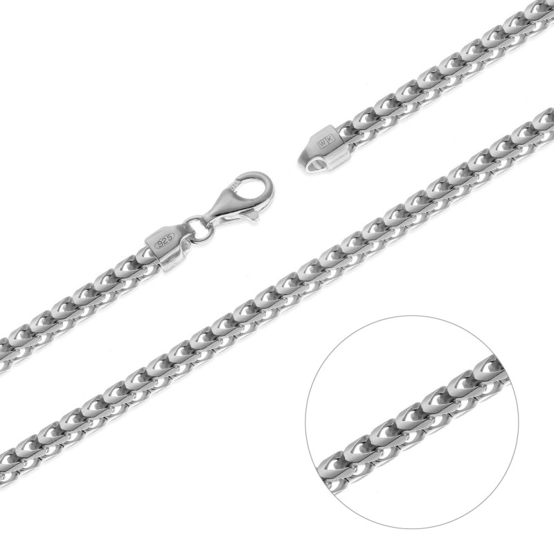Erdvinė rodžiuoto sidabro grandinėlė. Praba 925. Vyriška. Sudėtinga grandelių forma suteikia vienam grandinėlės šonui klasikinio pynimo Curb vaizdą, kitam šonui strėlinio pynimo pavidalą.