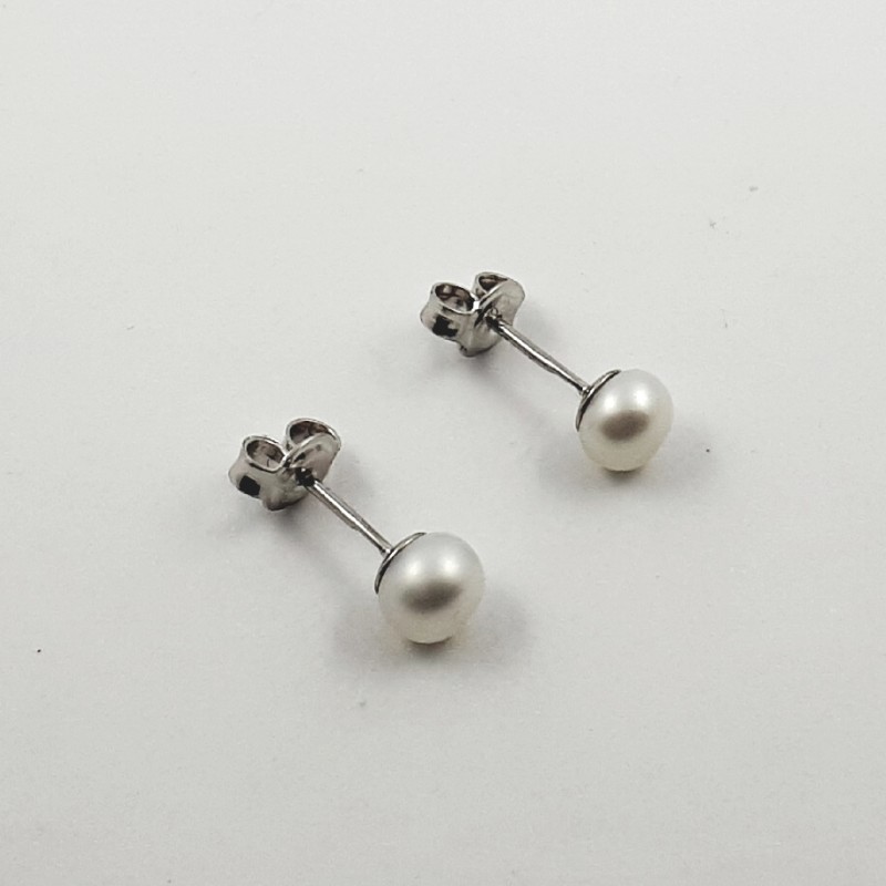 Sidabriniai auskarai su perlais. Praba 925. Balti kultūriniai (kultyvuoti) perlai. Užsegimai - strypeliai su fiksatoriais (vinukai).
