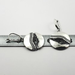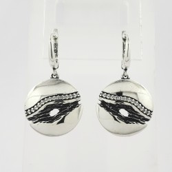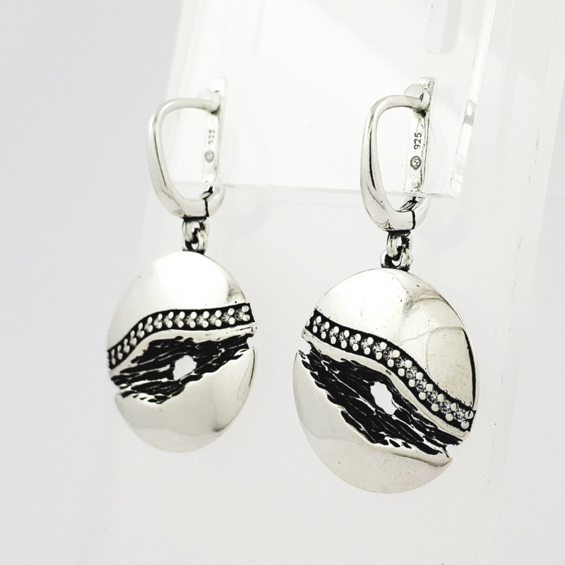 Kabantys sidabriniai auskarai su anglišku užsegimu. Juodinto sidabro ir poliruoto sidabro derinys. Lietas sidabras. Angliški užsegimai. Cirkonai.