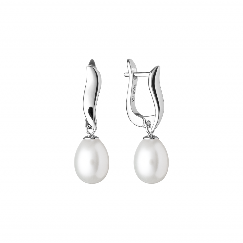 Sidabriniai rodžiuoti kabantys auskarai su perlais. Praba 925. Balti kultūriniai perlai 8-8,5mm. Angliški užsegimai.