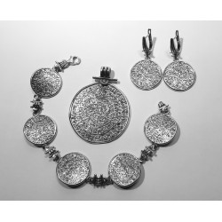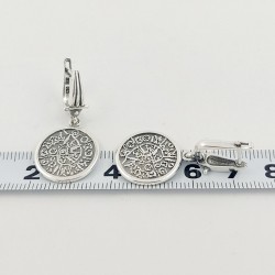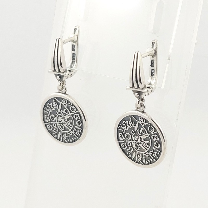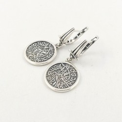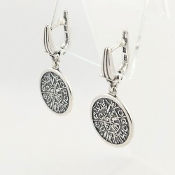Sidabriniai auskarai "Faisto diskas" - antikinio keramikinio disko, rasto Kretos saloje, pagrindu pagamintas papuošalas. Juodinto sidabro pagrinde- balto sidabro ženklų ornamentas. Galima derinti su kitais komplekto gaminiais. Kabantys auskarai su anglišku užsegimu. Lietas sidabras.Festo.Praba 925.