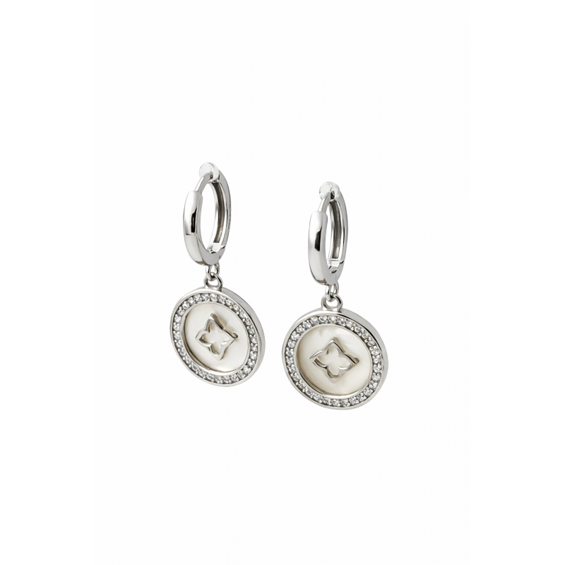 Rodžiuoto sidabro auskarai. Perlamutras, cirkonai. Praba 925. Užsegimai-uždaromas ratukas.
