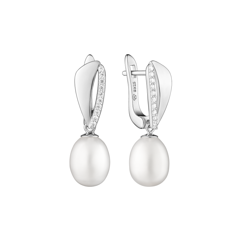 Sidabriniai rodžiuoti kabantys auskarai su perlais. Praba 925. Baltos spalvos kultūriniai perlai. Angliški užsegimai.