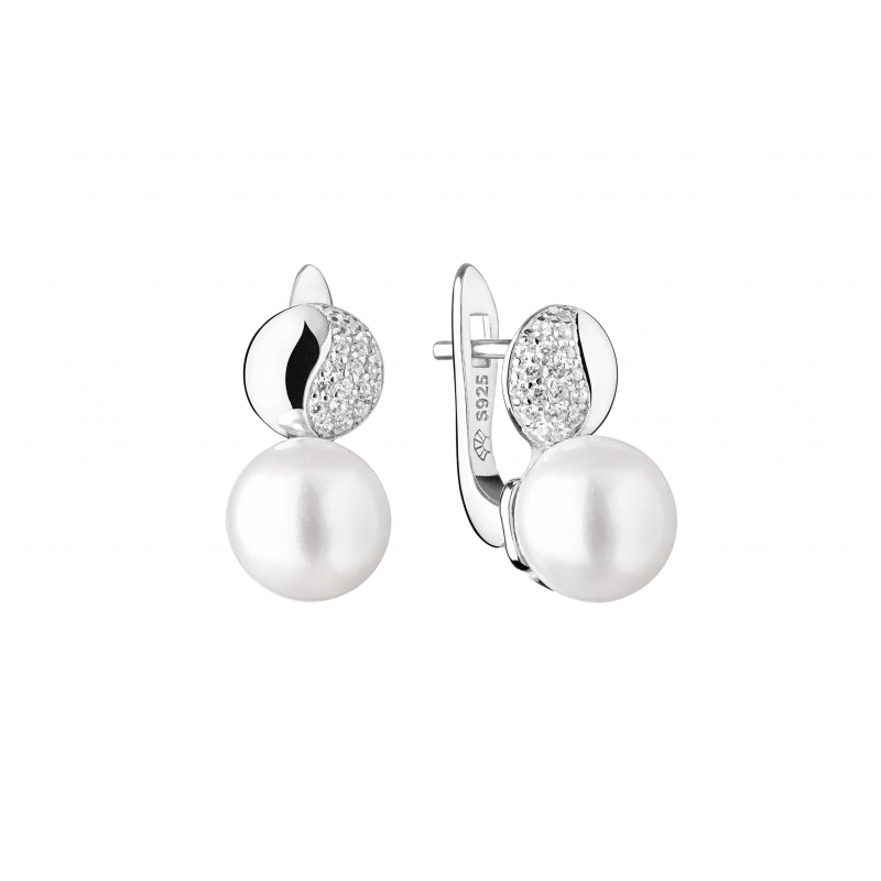 Rodžiu dengtas sidabras. Praba 925. Kultivuoti perlai 8 mm. Auskaro aukštis 15 mm. Cirkonai.
